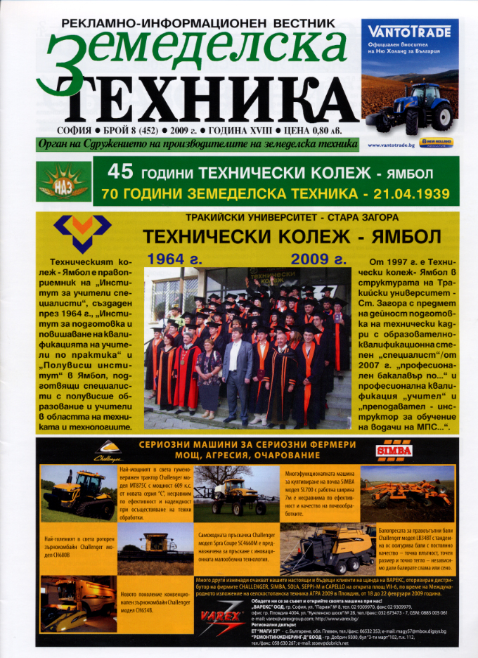 Брой 8 на в. „Земеделска техника” е посветен на честването на „45 години Технически колеж – Ямбол” и на „70 г. земеделска техника в България”.