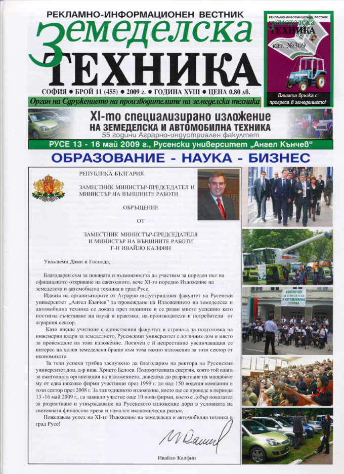 Брой 11 на в. „Земеделска техника” е посветен на XI-то СПЕЦИАЛИЗИРАНО ИЗЛОЖЕНИЕ НА ЗЕМЕДЕЛСКА И АВТОМОБИЛНА ТЕХНИКА в гр. Русе и на честването на 55-годишния юбилей на Аграрно-индустриалния факултет в Русенския университет „Ангел Кънчев”.