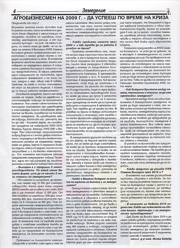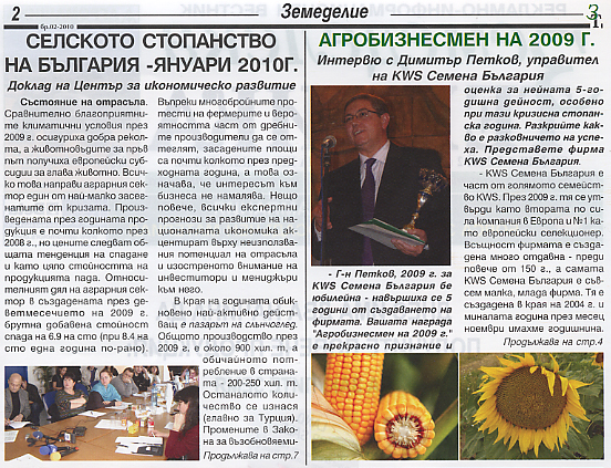 В интервюто „Бизнесмен на 2009 г. – да успееш по време на криза” - Димитър Петков, управител на KWS Семена България, представя дейността на фирмата през изминалия 5-годишен период и как са успели да се наложат в този отрасъл на земеделието. Посочва какви проблеми са имали, особено през 2009 г., как се работи в условия на криза, за да не си в загуба и какво предстои да решава KWS Семена България през 2010 г. Споделя за ролята на науката за бизнеса и за земеделието като цяло и как вижда връзката между семена, технологии и машини за постигане на по-голяма ефективност.