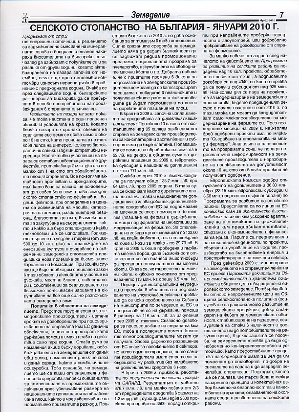 Поместен е докладът „Селското стопанство на България – януари 2010 г.” на Центъра за икономическо развитие, в който се прави оценка на състоянието на отрасъла през изминалата 2009 г. Констатира се, че аграрният сектор е един от най-малко засегнатия от кризата. Произведената през 2009 г. продукция е почти колкото през 2008 г., но цените са паднали. Всички експертни прогнози за развитие на националната икономика акцентират върху неизползвания потенциал на отрасъла и изостреното внимание на инвеститори и мениджъри към него. Разгледана е също каква ще бъде политиката в областта на земеделието през 2010 г. и какви са очакванията за развитие на отделните отрасли.