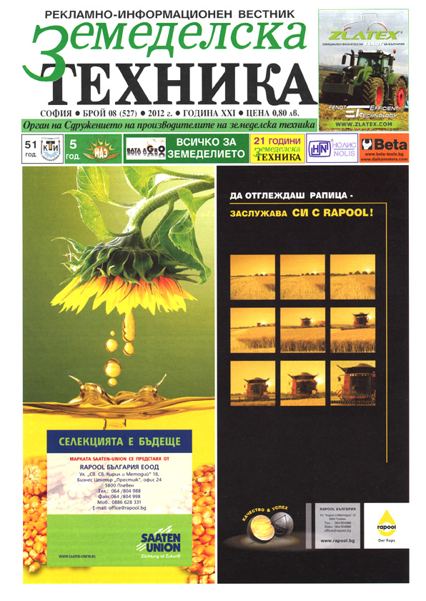 Темата на осми брой /527/ 2012 г. на в.”Земеделска техника” е „Всичко за земеделието”- предстоящото изложение БАТА АГРО, Стара Загора, Седмицата на гората и др. В рубриката „Информация” е поместена статията „Пловдивска каротина – нов сорт домати с висока биологична стойност” на гл. ас. д-р Д. Ганева и доц. д-р Г. Певичарова от Института по зеленчукови култури „Марица”, Пловдив. Новият сорт домати е създаден по метода на междувидовата хибридизация и е послужил за производство на доматен сок „Пловдивска каротина”, получил наградата за български иновативен продукт на международната селскостопанска изложба „Агра - 2012”. Има публикация за удостояването на проф. д-р Д. Димитров – ректор на Висшето училище по агробизнес и развитие на регионите, Пловдив, с почетна грамота и златна значка. Видният български учен е награден по повод 60-годишния му юбилей и за активна дейност в Спомоществователното сдружение „Свети Димитър”. Материалът „Дивечът в традиционната българска кухня” е във връзка с проведената кръгла маса на същата тематика в Гранд хотел „София”, организирана от МЗХ и Евро-Ток България – Сдружение на професионалните готвачи в нашата страна. По материали на БАТА е публикувана информация за третото поредно издание на Международното специализирано селскостопанско изложение БАТА АГРО, което ще се проведе в гр. Стара Загора от 8 до 12 май 2012 г. Опасността от тежки увреждания на човешкото здраве при употреба на хранителни добавки, маркирани с буквата Е, е темата на публикацията „Е-тата вредни за хората”. В рубриката „Гората” се съдържа информация за официалното откриване на Седмицата на гората -2012 г. в гр.Враца. Съобщава се за дейността на новооткрития Горски дом в парка „Врачански балкан” и за наградените лесовъди за 2011 г. Под заглавие „Държавни горски предприятия – 2011 г.” подробно са изложени общите финансови резултати от дейността на Държавните горски предприятия от създаването им до края на миналата година. Проблемът с хуманното отглеждане на кокошките-носачки и производството на яйца, съгласно Директива 1999/74/ЕО от 1 януари 2012 г., се съдържа най-подробно в материал на инж. Я. Илиев и инж. А. Андреев от Изпитателната лаборатория към КТИ – Русе, както и на инж.Г. Георгиев от „Първи май „ АД – гр. Полски Тръмбеш. В рубриката „На пазара на земеделска техника” се предлагат различни земеделски машини – нови и втора употреба, както и техните цени. В „Малки обяви” се предлагат машини, резервни части и др. В рубриката „Земеделски пазар” САПИ информира читателите за цените на зърнените култури, млечните и месни продукти, яйцата. МЗХ посочва и цените на основните хранителни продукти – брашно, олио, захар и др. Публикувани са реклами на водещи фирми за машини, технологии и продукти за земеделието и др.
