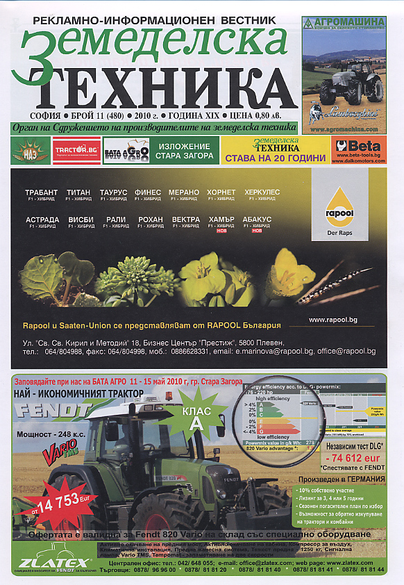 В рубриката „Земеделска техника” по материали на „ЗЛАТЕКС” е представена новата серия на трактор 800 VARIO на FENDT, като са посочени техническите новости.