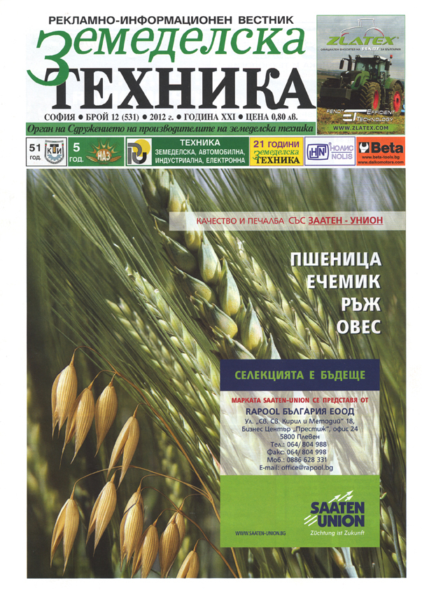 Тема на брой дванадесети /531/ на в.”Земеделска техника” за 2012 г. е земеделска, автомобилна, индустриална и електронна техниката.