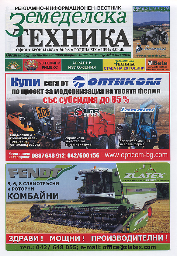 Основните теми на бр. 14 на в. „Земеделска техника”са: Аграрни изложения, 20 години Римекс, Земеделска техника става на 20 години.
