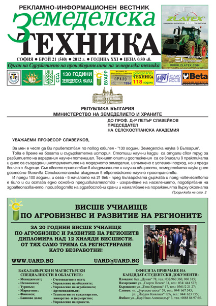 Темите на двадесет и първи брой /540/ 2012 г. на в. „Земеделска техника” е „130 години земеделска наука” и ”20 години Висше училище по агробизнес и развитие на регионите”.
