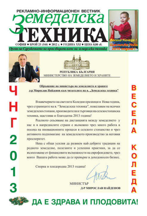 На първа страница е публикувано поздравлението на Министъра на земеделието и храните д-р Мирослав Найденов до всички от сектор „Земеделие” във връзка с настъпващата 2013 г.