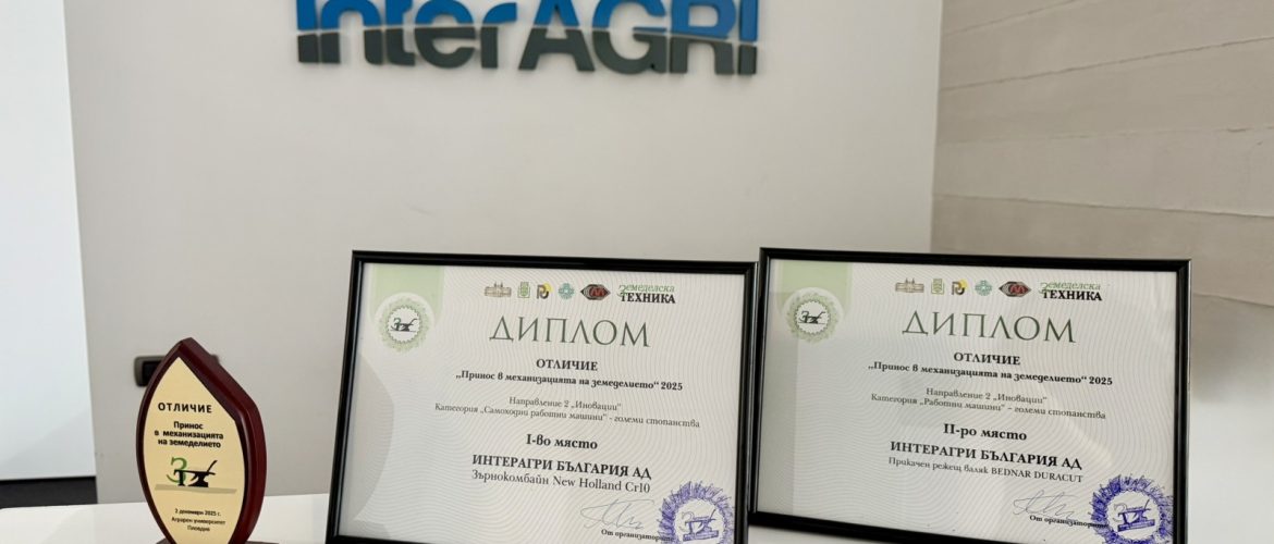 В Аграрния университет – Пловдив се проведе официалната церемония по връчване на ежегодните награди „Принос в механизацията – 2025“, на която Интерагри България беше отличена с два престижни приза. Постижението е ясен знак за значимото място на компанията в развитието на модерното българско земеделие и въвеждането на водещи световни технологии на пазара.